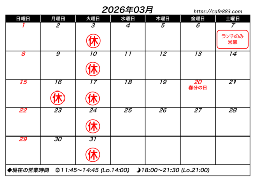 3月の営業カレンダーを更新致しました 2026年3月1日 3月の営業カレンダーを更新致しました。 16日の月曜日が休業日になります。 春分の日は通常営業です。 ムームードメイン ロリポップ公式サイト Categories: お知らせ